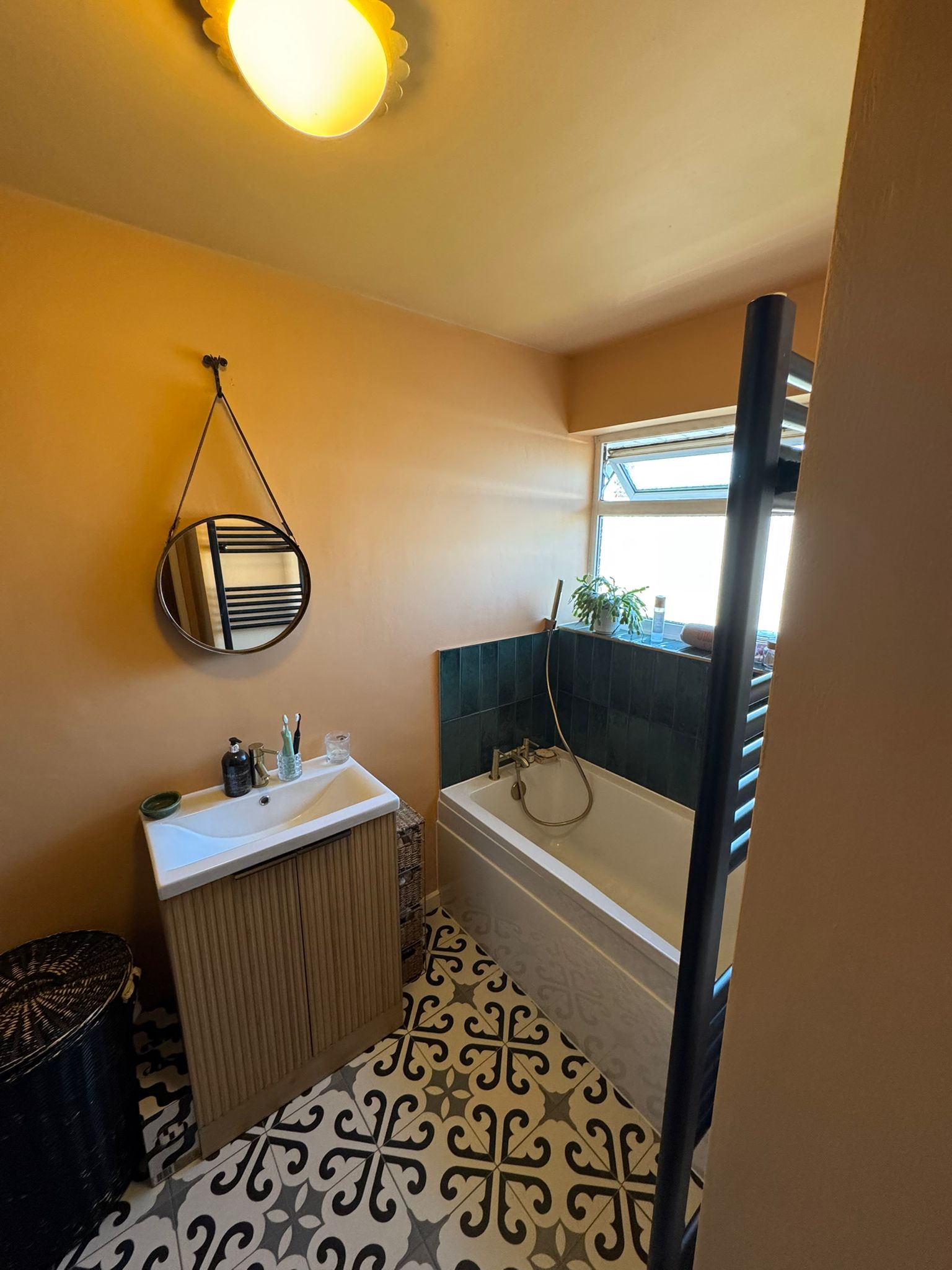 We completely reconfigured the layout, introduced Italian porcelain tiles, underfloor heating, and a walk-in rainfall shower. Brass fittings and soft wall lighting added warmth and elegance.