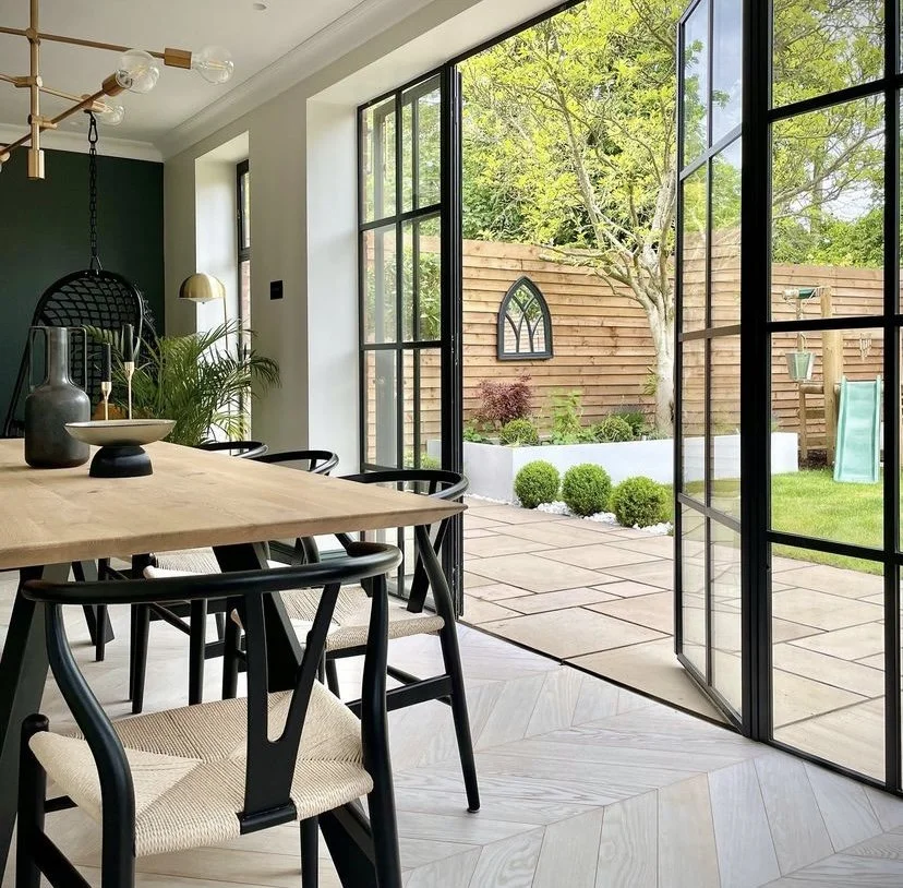 We built a single-storey rear extension with a steel frame and bi-fold doors, creating a seamless transition between indoor and outdoor spaces. Polished concrete flooring and neutral tones tied everything together. It resulted in a sunlit extension perfect for dining, relaxing, and entertaining year-round.